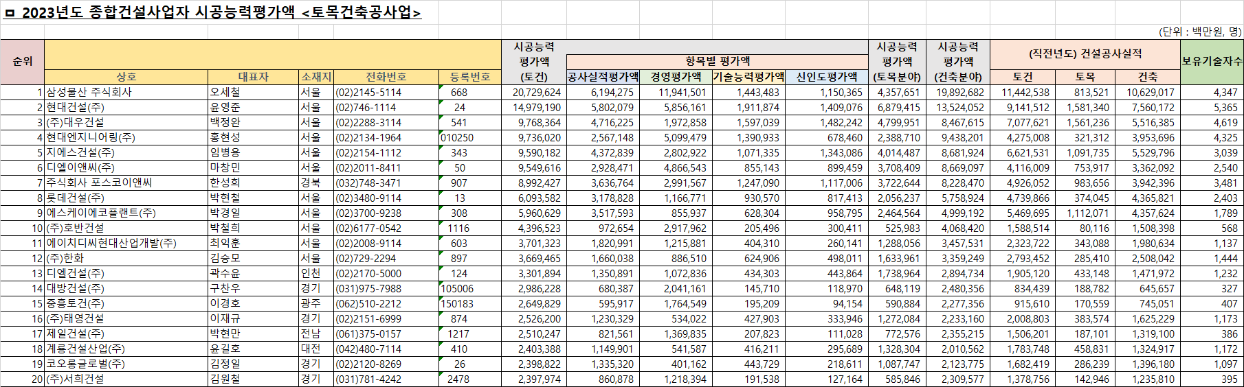 | 20 | (주)서희건설 | 김원철 | 경기 | (031)781-4242 | 2478 |