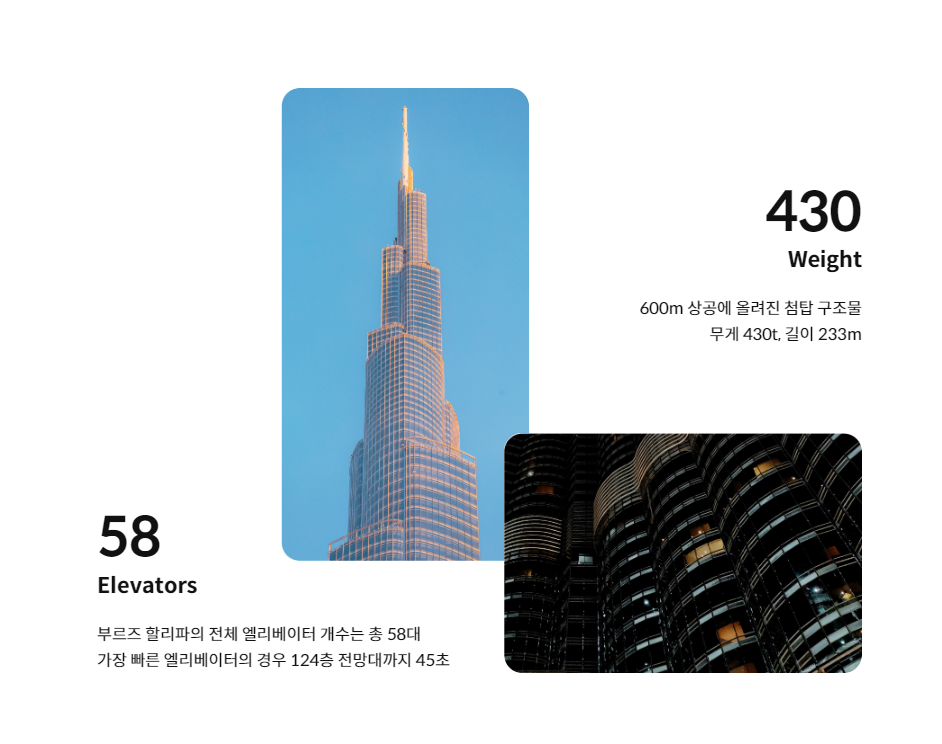 삼성물산 건설부문이 시공한 부르즈칼리파는 총 높이 828m, 163층 - 세계최고높이 / 총 연면적 15만평 호텔 200실 / 사무실 및 주거빌딩으로 구성되어있으며 내부에는 58개의 엘리베이터가 있습니다. 부르즈 할리파의 전체 엘리베이터 개수는 총 58대 가장 빠른 엘리베이터의 경우 124층 전망대까지 45초입니다.