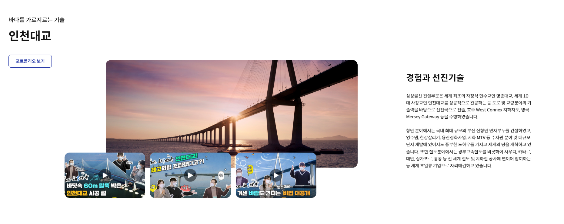 삼성물산 건설부문의 토목사업 포트폴리오는 인천대교를 예시로 들 수 있습니다.
