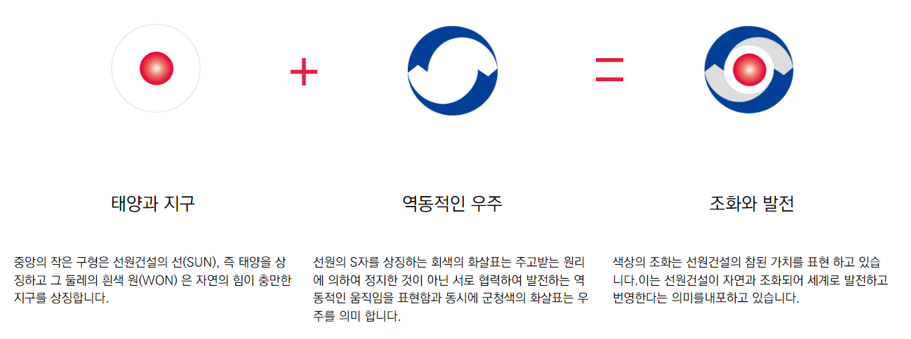 색상의 조화는 선원건설의 참된 가치를 표현 하고 있습니다.이는 선원건설이 자연과 조화되어 세계로 발전하고 번영한다는 의미를내포하고 있습니다.