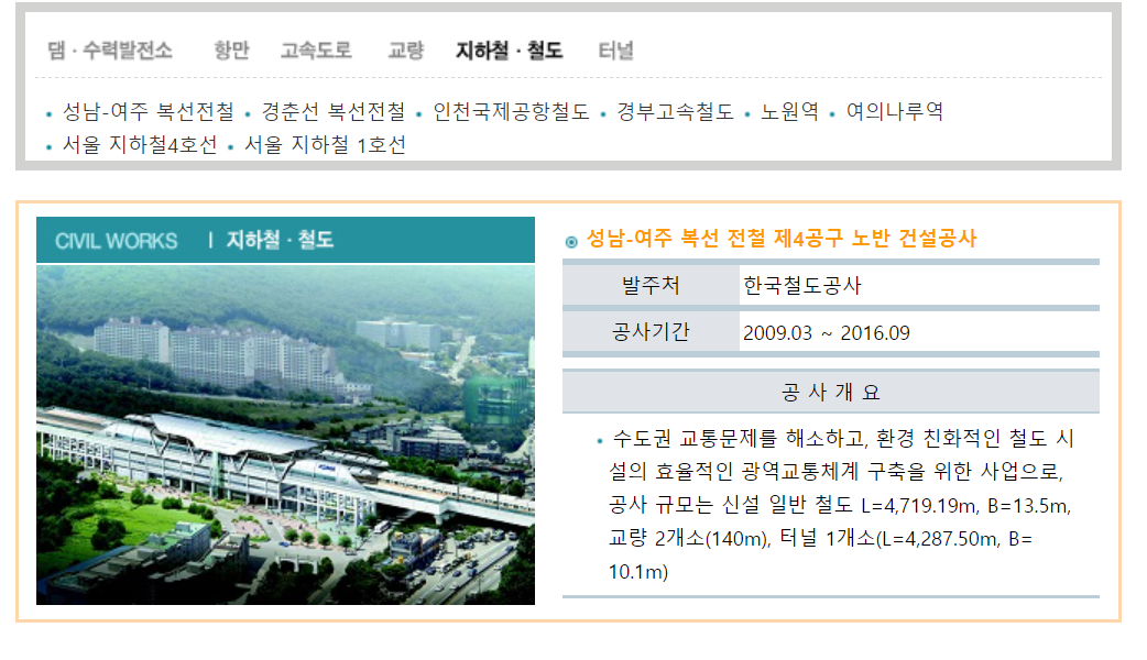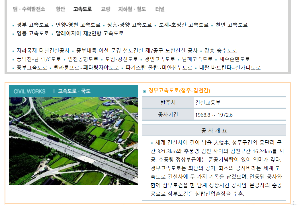 경부 고속도로 언양-영천 고속도로 장흥-광양 고속도로 도계-초정간 고속도로 천변 고속도로 영동 고속도로 말레이지아 제2연방 고속도로 자라목재 터널건설공사 중부내륙 이천-문경 철도건설 제7공구 노반신설 공사 장흥-송추도로 풍덕천-금곡I/C도로 인천공항도로 도암-강진도로 경인고속도로 남해고속도로 제주순환도로 중부고속도로 콸라룸프르~페다링자야도로 파키스탄 물탄~미얀찬누도로 네팔 바트칸다~실가디도로