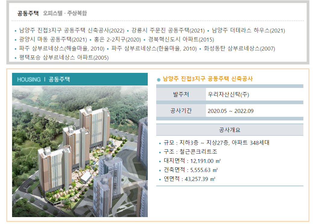 남양주 진접3지구 공동주택 신축공사(2022) 강릉시 주문진 공동주택(2021) 남양주 더테라스 하우스(2021) 광양시 마동 공동주택(2021) 홍은 2-2지구(2020) 경북혁신도시 아파트(2015) 파주 삼부르네상스(해솔마을, 2010) 파주 삼부르네상스(한울마을, 2010) 화성동탄 삼부르네상스(2007) 평택포승 삼부르네상스 아파트(2005)