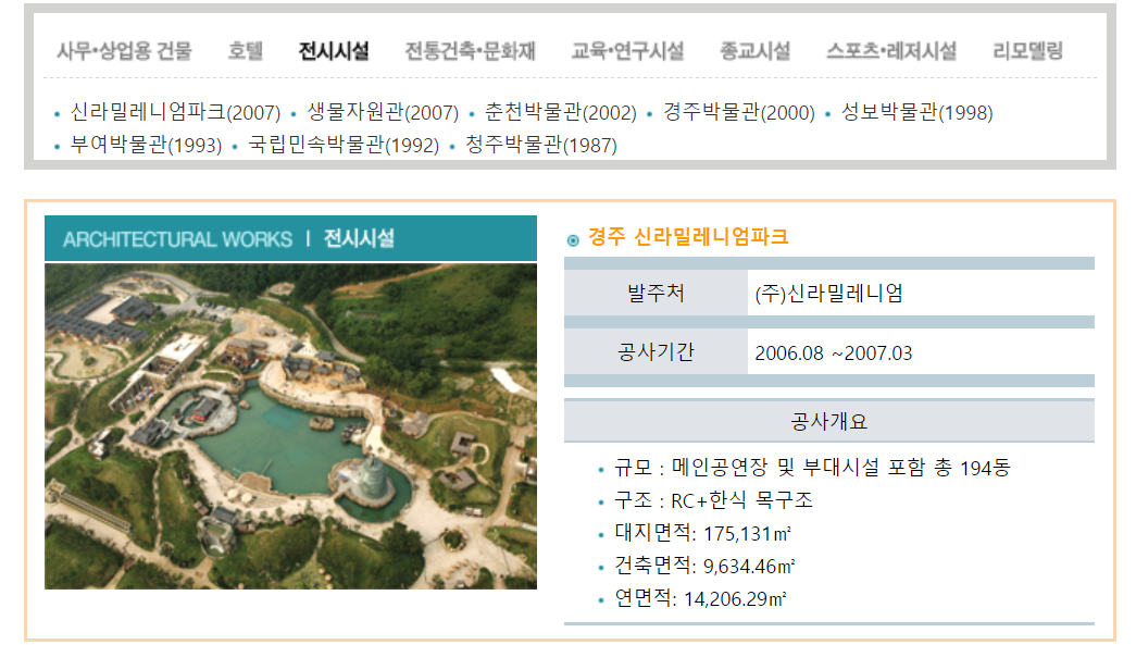 신라밀레니엄파크(2007) 생물자원관(2007) 춘천박물관(2002) 경주박물관(2000) 성보박물관(1998) 부여박물관(1993) 국립민속박물관(1992) 청주박물관(1987)