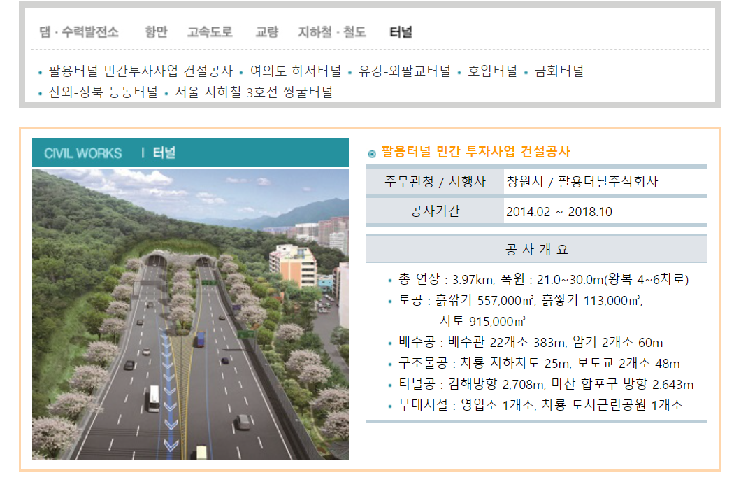 팔용터널 민간투자사업 건설공사 여의도 하저터널 유강-외팔교터널 호암터널 금화터널 산외-상북 능동터널 서울 지하철 3호선 쌍굴터널