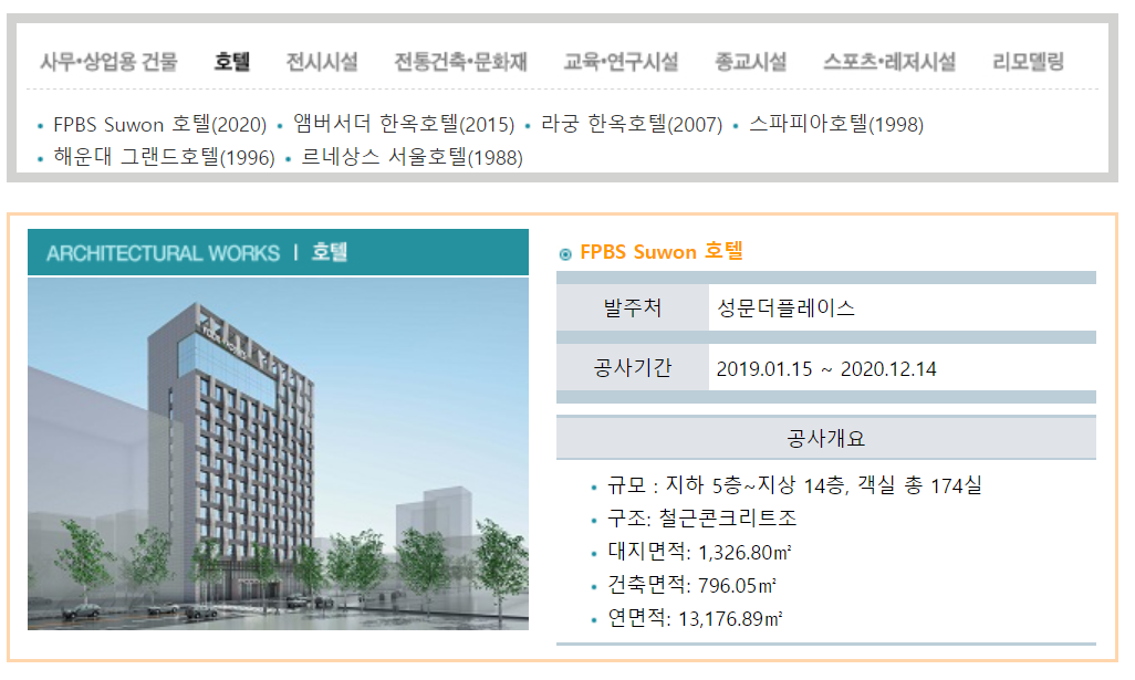 FPBS Suwon 호텔(2020) 앰버서더 한옥호텔(2015) 라궁 한옥호텔(2007) 스파피아호텔(1998) 해운대 그랜드호텔(1996) 르네상스 서울호텔(1988)
