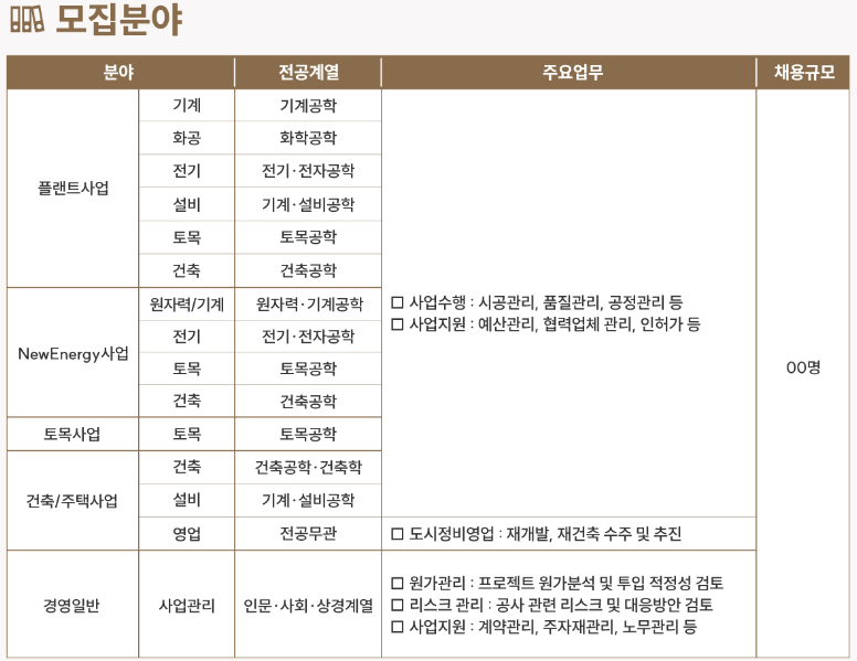 이번 채용의 모집분야는 크게 플랜트사업, 신재생에너지 사업, 토목사업, 건축/주택사업/ 경영일반으로 구분됩니다.