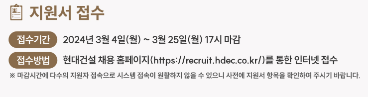 지원서는 현대건설 채용 홈페이지(https://recruit.hdec.co.kr/) 에서 접수가 가능하며, 신입/인턴 부분에서 찾으시면 됩니다.
