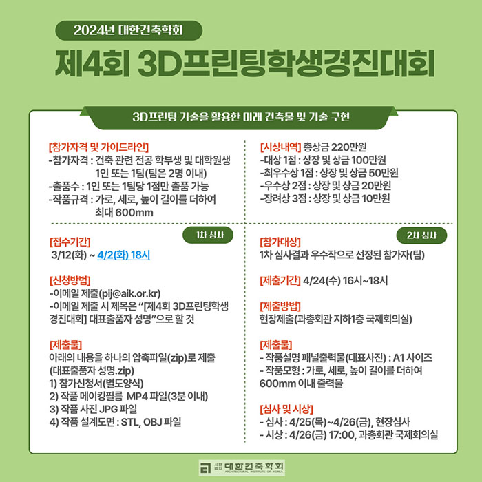- 신청방법 : 이메일 제출 (pij@aik.or.kr)※ 이메일 제출 시 제목은 “[3D프린팅학생경진대회] 대표출품자 성명”으로 할 것