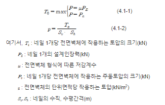 (4) 네일 1개당 전면벽체에 작용하는 하중은 네일의 설계인장력()에 전면벽체 형식에 따른 저감계수()를 곱한 값과 전면벽체 1개에 작용하는 주동토압의 크기()를 비교하여 큰 값을 적용하며, 전면벽체의 단위면적당 작용하는 하중()는 식(4.1-2)와 같다.