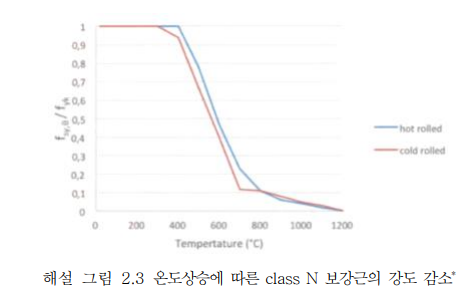 ③ 철근의 강도 및 탄성계수는 콘크리트와 마찬가지로 온도상승에 따라 감소한다. 그 특성은 철근의 종류에 따라 달라지며, 고온에서는 냉간압연보강재(cold deformed reinforcement)가 열간압연보강재(hot rolled reinforcement)보다 강도저하가 더 심한 것으로 알려져 있다. 해설 그림 2.3과 해설 그림 2.4는 온도상승에 따른 철근의 항복강도와 탄성계수의 감소에 대한 사례를 나타내었다.