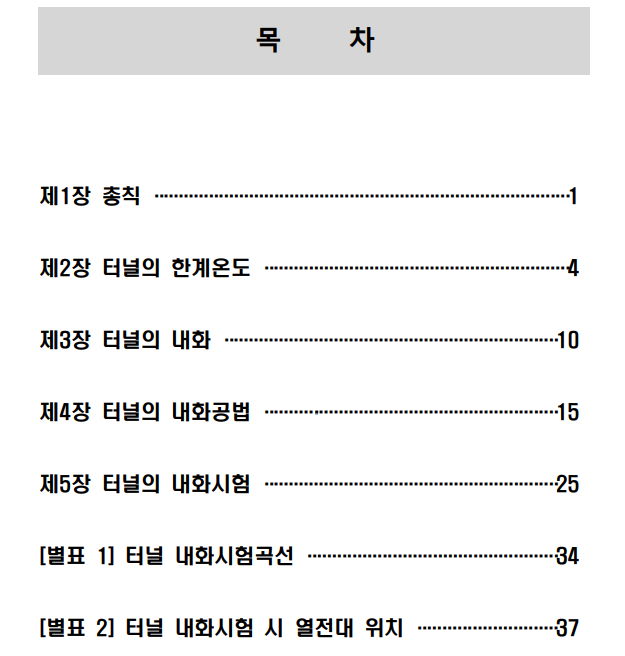 제1장 총칙: 터널의 내화에 관한 일반적인 규정과 용어 정의가 포함됩니다.