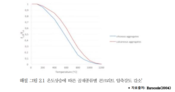 【해설】① 콘크리트는 노출되는 온도가 상승함에 따라 압축강도 및 탄성계수는 감소한다. 이는 온도에 의한 콘크리트의 열적분해(thermal decohesion) 또는 열적손상(thermal damage)으로 설명할 수 있다. 일반적으로 콘크리트의 압축강도는 약 600℃에 노출될 경우 상온강도의 약 50% 수준인 것으로 알려져 있다. 이러한 온도에 따른 강도 및 탄성계수의 변화는 사용하는 골재의 종류에 많은 영향을 받는 것으로알려져 있다. 해설 그림 2.1에서와 같이 온도가 약 200℃까지는 강도의 감소가 거의 없지만 750℃ 이상에서는 설계에 반영할 수 있는 강도의 수준이아니다. 일반적으로 설계 시 적절한 수준의 화재 규모에 대해 구조 부재의 허용강도는 콘크리트 압축강도의 30~50% 범위 내에 있는 것으로 가정한다. 안전성에 대한 사례로, 1992년 네덜란드에서는 안전수준을 1.7로 가정하여, 즉 콘크리트의 압축강도가 59% (100%/1.7) 까지 줄어든 경우가 안전계수 1.0인 것으로 판단하였고, 이는 해설그림 2.1을 참조할 경우 구조물이 파괴되기 직전의 온도가 약 450℃라는 것을 의미한다. 또한 이미 고온에 노출되어 초기강도가 낮아진 상태의 콘크리트 표면에는 미세균열(hair crack) 또는 박리(spalling)가 발생하였을 수 있다. 따라서 구조물의 하중지지능력을 유지하기 위해서는콘크리트의 온도가 350~400℃ 수준 이내이어야 한다.