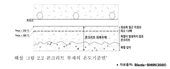 반면, 섬유혼입 등 1)의 콘크리트 자체내화공법을 적용한 경우에는 네덜란드 정부기관인 Rijkswaterstaat (Ministry of Infrastructure and Water Management, 국내 국토교통부에 해당)와 네덜란드 연구기관인 Efectis Nederland의 공동 성과물인 Efectis-R0695:2020의 내화 실험 방법을 참고하여 온도기준면을설정할 수 있다. 콘크리트 자체내화공법을 적용할 경우, 콘크리트표면에 가까운 최외측 철근 직경의 최소 1.0배 떨어진 위치를 온도기준면으로 권고하고 있다. 기타 내화공법의 경우, 온도기준면은 콘크리트 부재의 표면을 기준으로 하되 발주기관과 협의하여 결정한다.