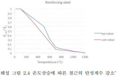 ③ 철근의 강도 및 탄성계수는 콘크리트와 마찬가지로 온도상승에 따라 감소한다. 그 특성은 철근의 종류에 따라 달라지며, 고온에서는 냉간압연보강재(cold deformed reinforcement)가 열간압연보강재(hot rolled reinforcement)보다 강도저하가 더 심한 것으로 알려져 있다. 해설 그림 2.3과 해설 그림 2.4는 온도상승에 따른 철근의 항복강도와 탄성계수의 감소에 대한 사례를 나타내었다.