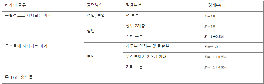 표 1.6-2 비계 위치에 대한 보정계수(F)