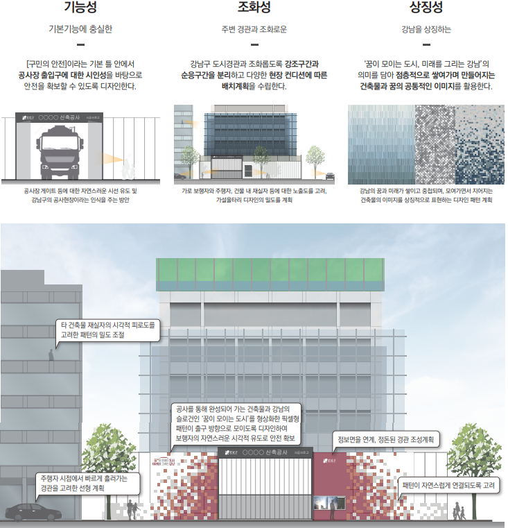 강남구 가설울타리 디자인계획은 기능성, 조화성, 상징성이 주축으로 되어 계획한 디자인을 바탕으로 공사장 출입구, 공사안내면, 공사장 가설울타리 등에 대한 기본디자인을 제시하고 다양한 공모안들이 조화롭게 배치될 수 있도록 계획하였습니다.