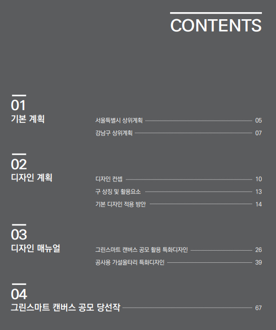 해당 메뉴얼의 목차는 기본계획, 디자인계획, 디자인 매뉴얼, 그린스마트 캔버스 공모당선작으로 구성되어 있습니다.