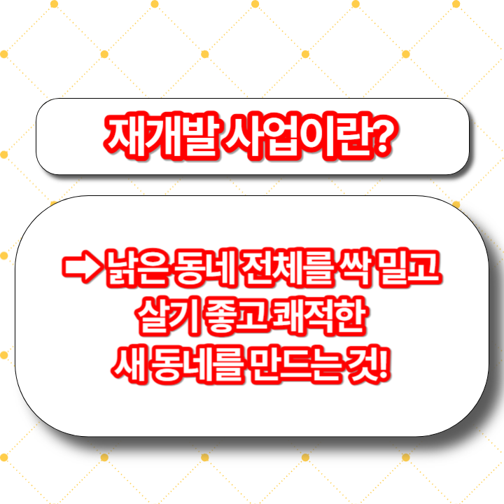 - 재개발: 단순히 오래된 건물만 있다고 해당되는 것은 아니에요! 도로, 공원 등 기반 시설이 매우 부족하거나 건축물 밀집 등으로 화재, 안전사고 위험이 높아야 해요.