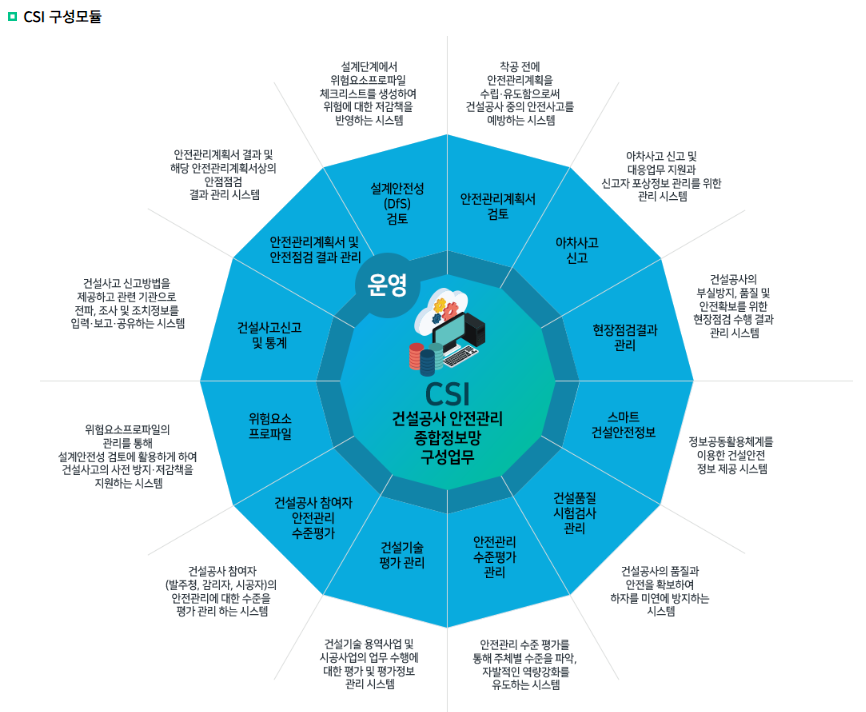 CSI는 설계 단계부터 시공, 준공까지 건설 공사 전 과정에 걸쳐 안전 관리를 지원하는 다양한 모듈로 구성되어 있습니다.