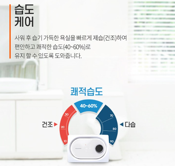 - 쾌적한 욕실 환경을 유지하며, 옷이나 수건의 곰팡이 발생을 예방합니다.