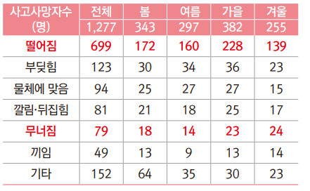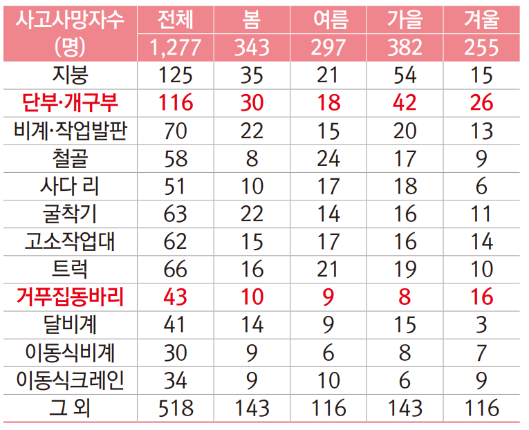 단부·개구부 등의 사고가 전체의 상위를 차지하며, 거푸집·동바리 사고 또한 다른 계절에 비해 겨울철에 많이 발생하는 특징이 있으므로 주의가 필요합니다.