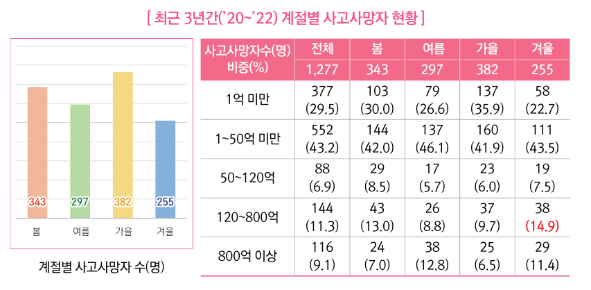 건설현장은 계절에 관계없이 50억 미만 소규모 현장에 사망사고가 집중되나 120억 ~ 800억원 미만 규모에서는 다른 계절에 비해 겨울철 사망사고가 많이 발생하는 경향이 있다는것을 알 수 있습니다.