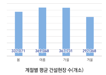 최근 3년간 계절별 평균 건설현장 수는 위의 그래프와 같습니다. 겨울철은 비교적 다른 계절보다 작은 사업장이 있다는 것을 보여줍니다.