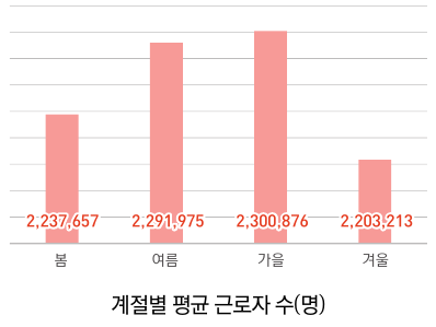 최근 3년간 계절별 평균 건설현장 근로자 수는 위의 그래프와 같습니다. 겨울철은 비교적 다른 계절보다 작은 근로자수이지만 10만명정도의 차이만 보여주는 편입니다.