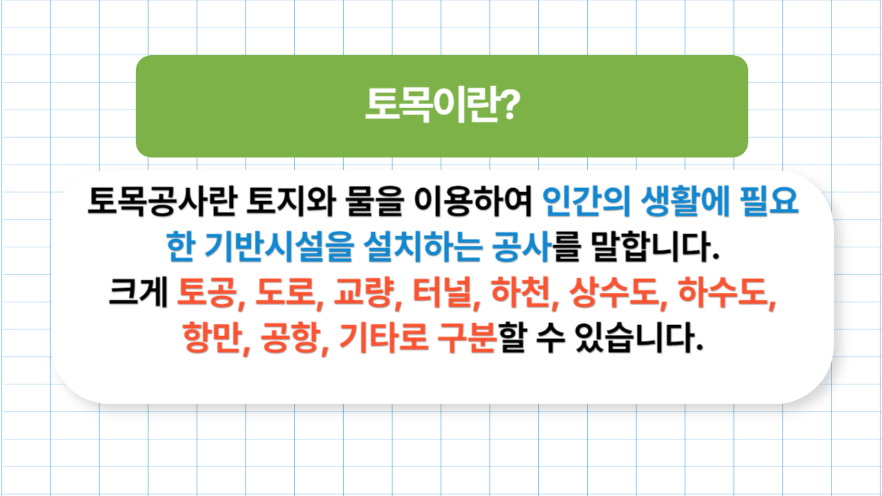 토목공사란 토지와 물을 이용하여 인간의 생활에 필요한 기반시설을 설치하는 공사를 말합니다. 토목공사는 크게 토공, 도로, 교량, 터널, 하천, 상수도, 하수도, 항만, 공항, 기타로 구분할 수 있습니다.