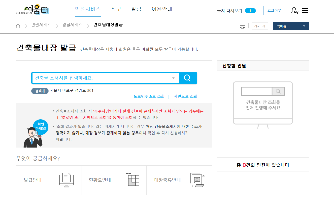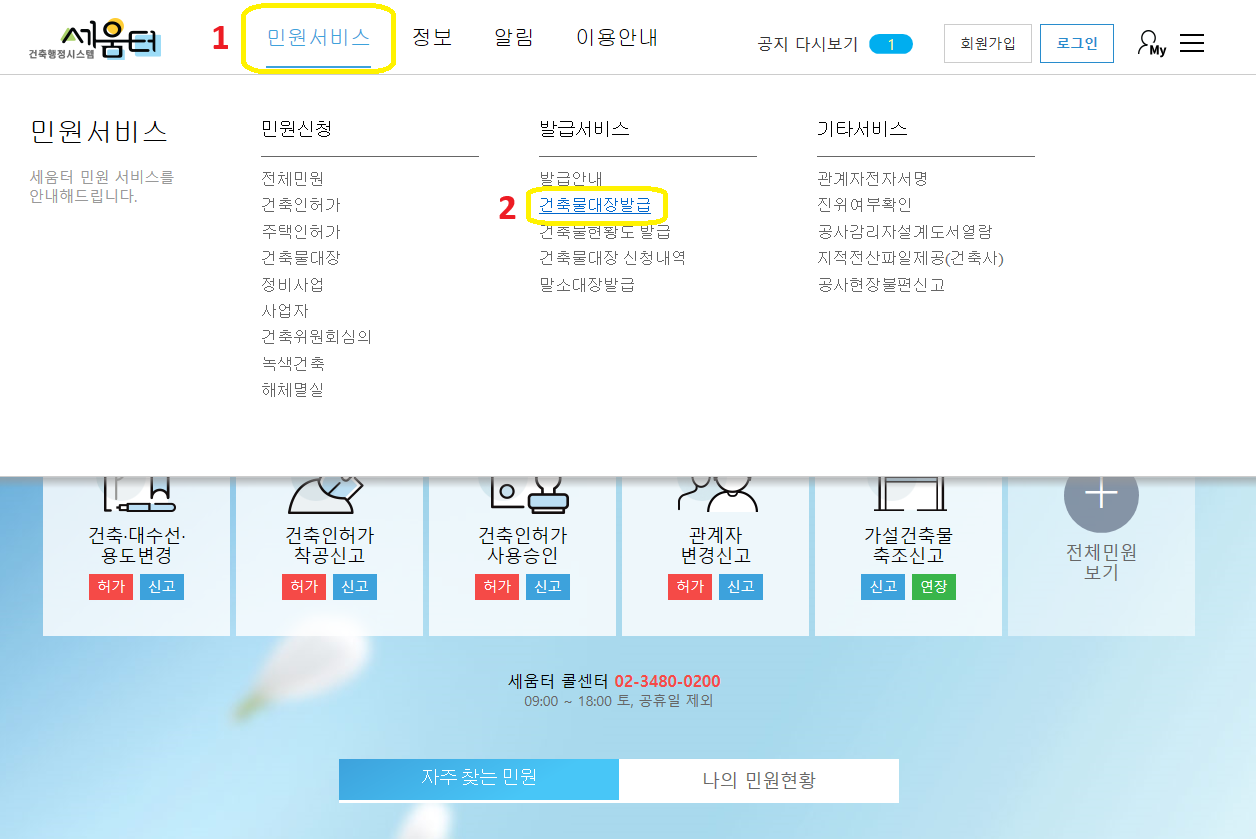 1. 민원서비스 - 건축물대장을 클릭합니다.