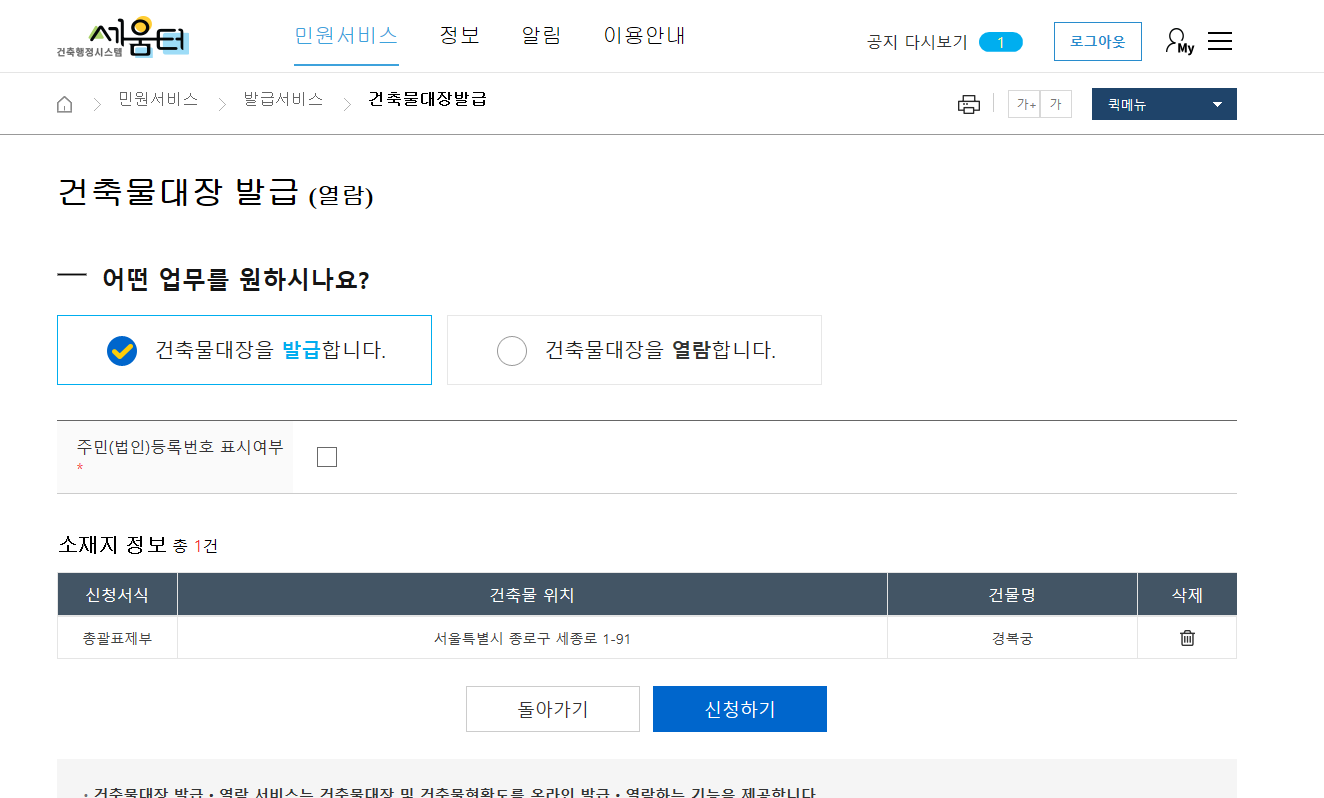 7. 내역이 담긴 것을 확인하였으면 건축물 대장 발급 신청을 눌러줍니다.