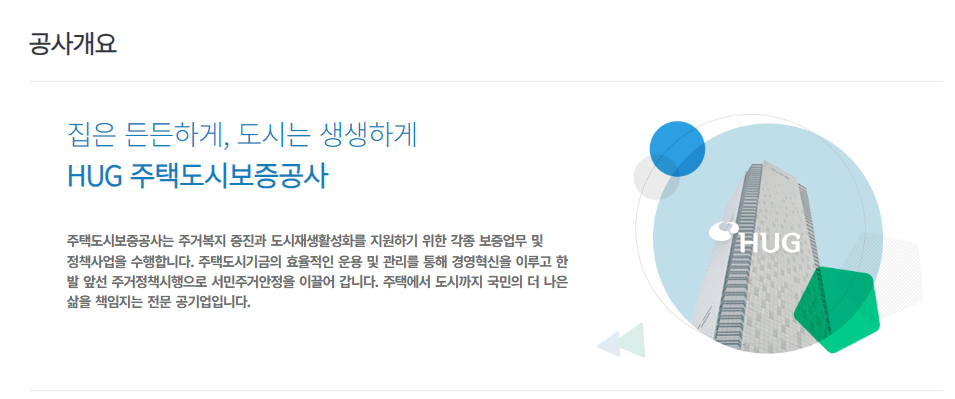 HUG는 주택도시보증공사로, 주택도시보증공사는 주거복지 증진과 도시재생활성화를 지원하기 위한 각종 보증업무 및 정책사업을 수행합니다. 주택도시기금의 효율적인 운용 및 관리를 통해 경영혁신을 이루고 한 발 앞선 주거정책시행으로 서민주거안정을 이끌어 갑니다. 주택에서 도시까지 국민의 더 나은 삶을 책임지는 전문 공기업입니다.