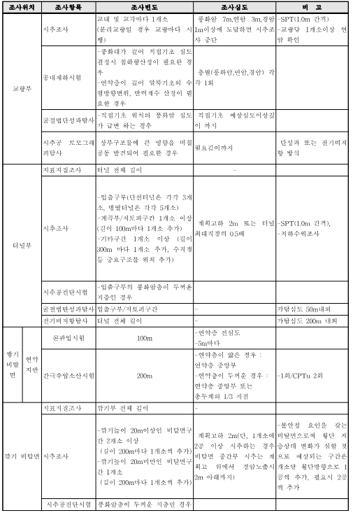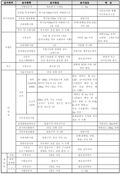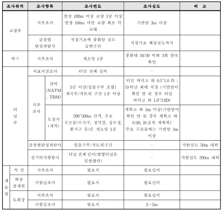 주) 1) 토취장 조사는 개소 당 시추는 2개소 이상, 심도는 경암 5m까지 수행하며, 시험굴은 5개소 이상 실시한다. 2) 단선병렬 터널의 경우, 두 터널 중심 간의 거리가 5D(터널 폭) 이상 이격되었을 경우, 각각의 터널로 지반조사를 수행한다. 3) 여건에 의해 시추조사를 실시하지 못하는 경우(지형조건, 민원 등) 발주처의 승인을 받아 물리탐사(굴절법탄성파검사 등)로 대체할 수 있다. 4) 위 기준은 최소 권장사항이며, 사업규모 및 특성에 따라 수량 및 심도를 증가하여 정밀조사를 실시한다. 5) 터널부 시추조사에서 산악이란 구릉지 또는 산이 형성되어 있는 지역을 말하며 도심지란 시가지를 형성하고 있는 지역을 말한다.