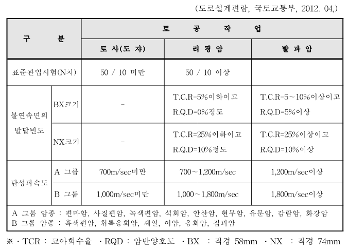 ② 리핑암과 발파암의 경계를 시추자료로 판단할 때, T.C.R이 25% 이하(NX기준)로 불량하고, R.Q.D가 10% 이하(NX기준)이면 발파보다 리핑작업이 유리하므로 리핑암으로 구분한다. 또한, 리핑암과 발파암은 암반의 굴착특성을 결정하는 불연속면의 발달빈도와 탄성파속도를 기준으로 하여 다음 표에 따라 구분한다.