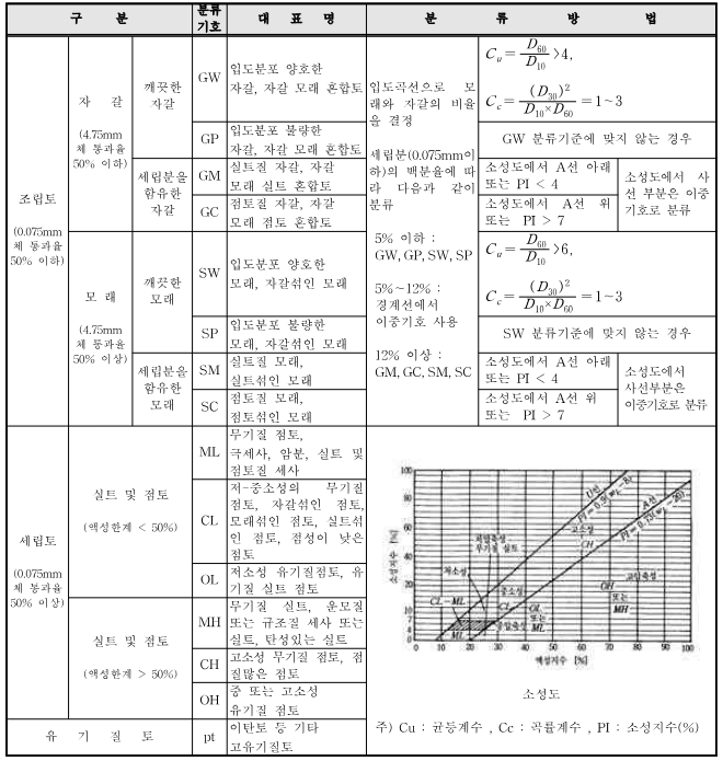 ① 개 요 통일 분류법은 흙의 입도시험방법(KSF 2302), 흙의 액성한계․소성한계 시험방법(KSF 2303)에 따른 시험결과를 근거로 분류하는 것으로서 흙의 종류를 2개의 로마문자 조합으로 나타낸다.