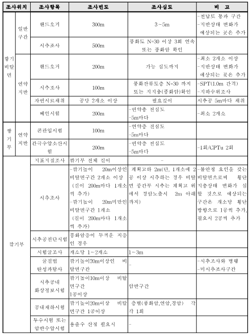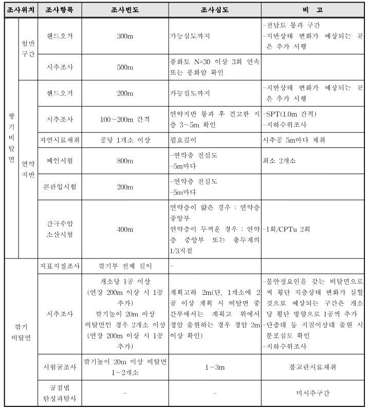 3) 위 기준은 최소 권장사항이며, 사업규모 및 특성에 따라 수량 및 심도를 증가하여 정밀조사를실시한다.
